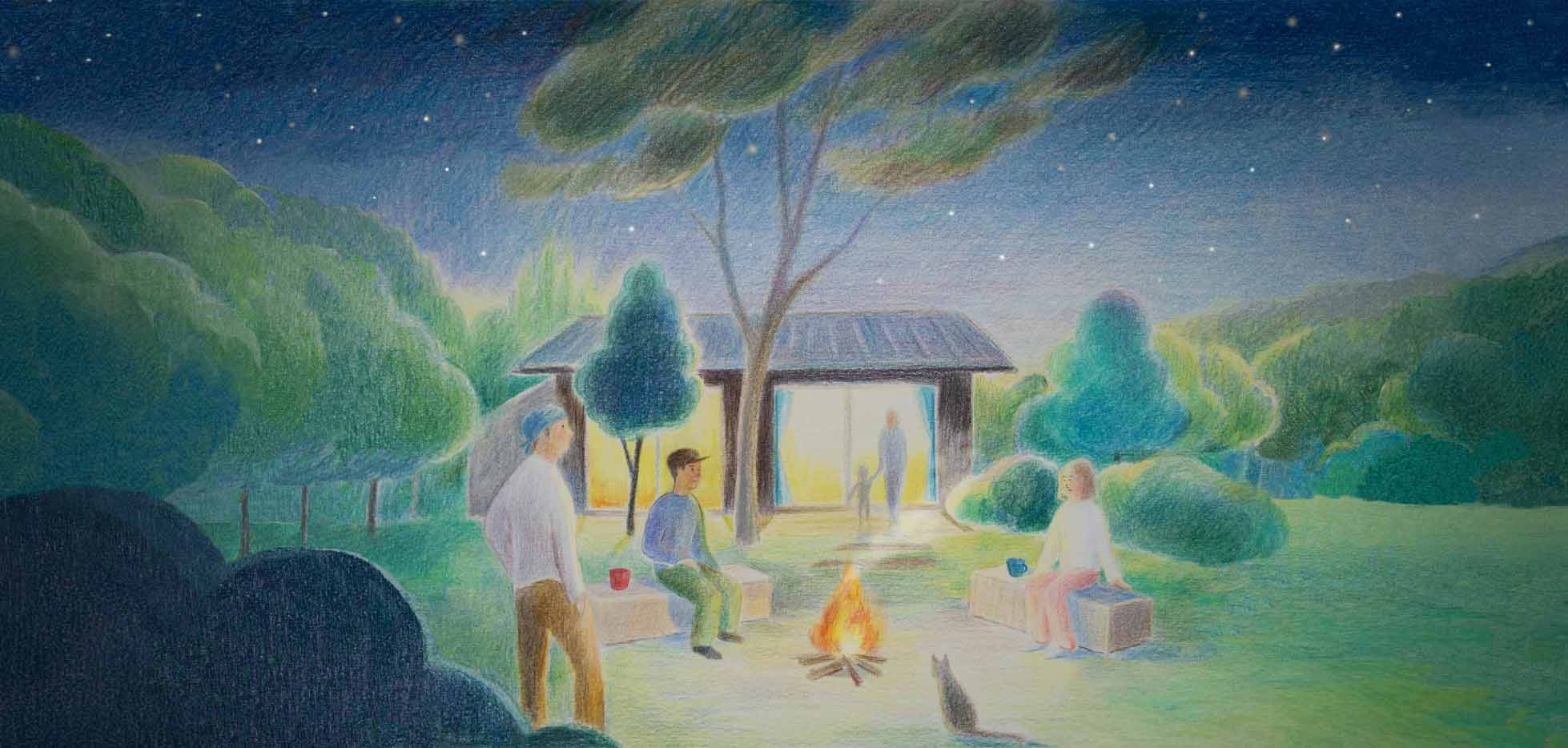 | 2022 | 2022年までの4年をかけ、自分達の木材を使い、自分達の手で家屋の修繕、リノベーションを行う。 2022年7月 旅館業許可 取得。 焚き火の宿 ノキロをオープンする。 現在も家屋、土地、山林部の整備は継続中。 |